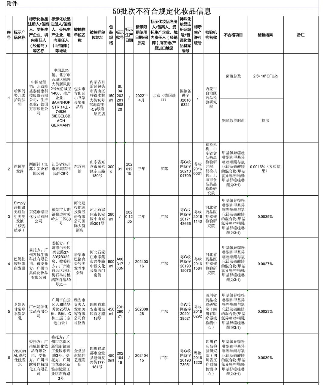 通告显示,在2021年国家化妆品监督抽检工作中,经检验,德国万事乐德公司生产、北京隆盛泰健康科技股份有限公司经销的哈罗闪婴儿柔护润肤霜不符合规定,检验结果为菌落总数超标和检出铜绿假单胞菌。委托方上海丰邑信息科技发展有限公司、被委托方上海缇曼生物科技有限公司生产的稚优泉酵母焕颜修护面膜不符合规定,检验结果为菌落总数超标。标示经销者为资生堂(中国)投资有限公司的安热沙水能户外清透防晒乳SPF50+·PA+++不符合规定,检出批件及标签未标示的防晒剂水杨酸乙基己酯。标示化妆品境内责任人(经销商)否认经营。标示委托方为北京同仁堂化妆品有限公司、受托方为珠海市恒美化妆品制造有限公司生产的同仁堂植物原浆毛发修护发膜不符合规定,检验结果为甲基氯异噻唑啉酮和甲基异噻唑啉酮与氯化镁及硝酸镁的混合物(甲基氯异噻唑啉酮:甲基异噻唑啉酮为3:1)不符合规定。标示化妆品注册人/备案人、受托生产企业否认生产。国家药监局要求广东、浙江省药品监督管理部门对上述50批次不符合规定化妆品涉及的注册人、备案人、受托生产企业、境内责任人依法立案调查,责令相关企业立即依法采取风险控制措施并开展自查整改。另外,各省(区、市)药品监督管理部门责令相关化妆品经营者立即停止经营上述化妆品,依法调查其进货查验记录等情况,对违法产品进行追根溯源;发现违法行为的,依法严肃查处;涉嫌犯罪的,依法移送公安机关。